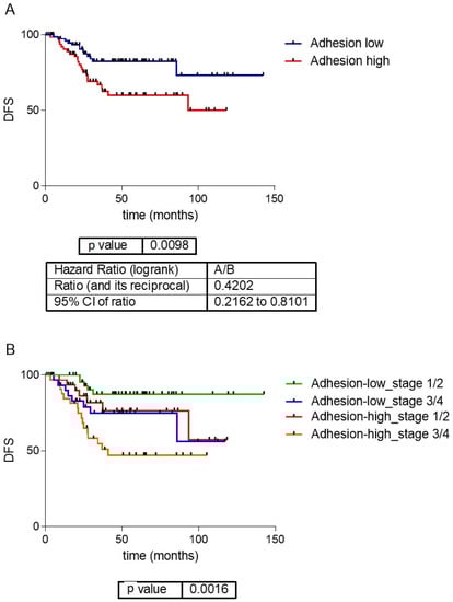 (A) Survival analysis of the adhesion groups. Low-adhesion tumors showed a significantly better prognosis than high-adhesion ones. (B) Survival curves of the adhesion groups by tumor stage. DFS: disease-free survival.