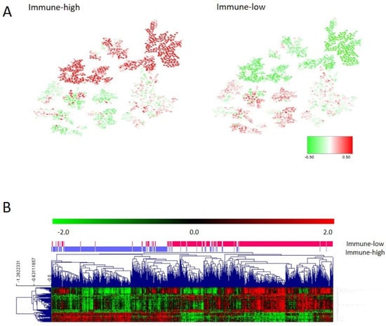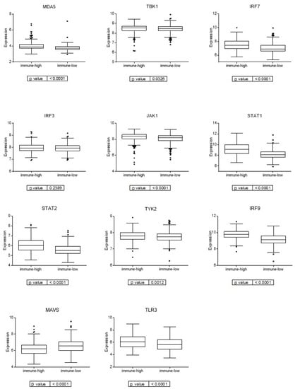 As the viral mimicry response has gained relevance in the last few years in cancer related to immune response activation [31], we studied the expression of the genes involved in the viral mimicry response in the two immune groups. These immune groups presented differential expression of the genes involved in the viral mimicry response, being higher in the immune-high group (Figure 5).