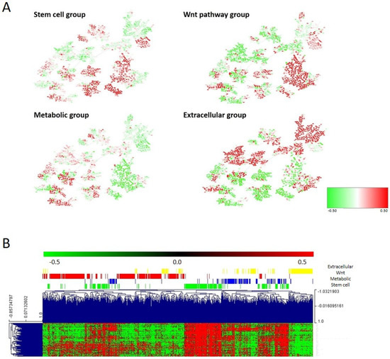 Differentially expressed genes between these molecular groups were identified using SAM (Figure 6B and Supplementary Table S4). The stem cell group showed also the overexpression of genes related to fatty acid metabolism, such as UGT1A1 or UGT1A5, and mucins. The metabolic group showed the overexpression of genes involved in metabolic pathways, including cholesterol or tryptophan metabolism. The Wnt group showed also the overexpression of genes involved in retinol metabolism or epidermal growth factor receptor binding, among others. The extracellular group showed the overexpression of plasma membrane genes.