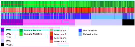 On the other hand, CMS4 is the subtype with the worst prognosis [7]. Regarding the adhesion subtype, 98% of CMS4 patients belong to the high-adhesion group, and this is consistent with the survival analysis that determined that the adhesion layer had prognostic value, showing worse prognosis in high-adhesion tumors.