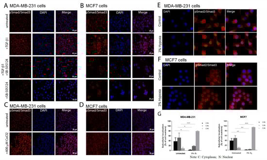 Immunocytochemical (ICC) analysis for pSmad2/3 expression following treatment with TGF-β1 or CoCl2 in both MDA-MB-231 and MCF7 cell lines. Increased expression of pSmad demonstrates activation of the TGF-β signalling pathway in both breast cancer cell lines upon treatment with 5 and 10 ng/mL TGF-β1, respectively, for 72 h compared to controls and untreated cells. Note the addition of 5 µM of SB-505124 in the presence or absence of TGF-β1 results in decreased pSmad expression in both cell lines (A) MDA-MB-231 (B) MCF7 cells. ICC images for pSmad2/3 staining showing activation of the TGF-β signalling pathway induced via exposure to 400 μΜ CoCl2 for 48 h in (C) MDA-MB-231 and (D) MCF7 cells or culture in 3% oxygen for 48 h in (E) MDA-MB-231 and (F) MCF7 cells. (G) Graphical representation of the proportion of cells showing either cytoplasmic (C) or nuclear (N) localization after hypoxia exposure; C < N, C = N, C > N. Note increased pSmad staining after treatment compared to that in negative control and untreated cells. Representative images from n = 3 experiments. Scale bar = 20 µm, pSmad expression = red, nuclei were stained with Dapi = blue. (E,F) Original magnification 40×. p values * p value < 0.05, ** p value < 0.005, *** p value ≤ 0.001.