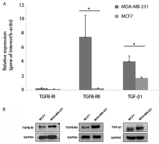 q-PCR analysis was used to measure mRNA expression of TGF-β1, TGFB-RI and TGFB-RII. There was no significant difference in expression of TGFB-R1 between the two cell lines (Figure 2A), while levels of TGF-β1 and TGFB-RII were significantly higher in the MDA-MB-231 than in the MCF7 cells (p = 0.04) (Figure 2A). In addition, endogenous expression of TGF-β1, TGFB-R1 and TGFB-RII protein was determined using Western blotting for both cell lines. Both cell lines expressed TGF-β1 and both receptors, with expression in all cases being lower in the MCF7 than the MDA-MB-231 (Figure 2B). Images of whole western blots are provided (Supplementary Figure S1).