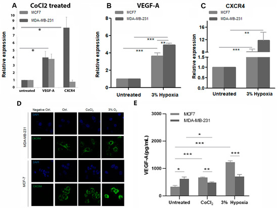 To determine if CoCl2 induced hypoxic conditions in MDA-MB-231 and MCF7 cell lines, the levels of two hypoxia-responsive genes VEGF-A and CXCR4 before and after treatment with 400 μΜ CoCl2 for 24 h were measured (Figure 3A). Controls were untreated cells of both cell lines. VEGF-A and CXCR4 mRNA expression levels were increased significantly in the treated MDA-MB-231. The expression of VEGF also increased in the MCF7 treated cells compared to control, but this was not significant and CXCR4 expression was not increased. This was compared to expression of the above two hypoxia-responsive genes in both cell lines being cultured under hypoxic conditions (3% oxygen). This led to an increase in both VEGF-A and CXCR4 in both cell lines compared to controls (controls were cells incubated under normal TC oxygen levels for 24 h). The increase in VEGF-A levels was significantly different in both cell lines compared to controls (Figure 3B). While an increase in VEGF-A levels between hypoxia treated MDA-MB-231 and hypoxia treated MCF7 was observed with levels being higher in MDA-MB-231 (Figure 3B). CXCR4 expression was also increased significantly for both hypoxia-treated cell lines compared to controls (Figure 3C).