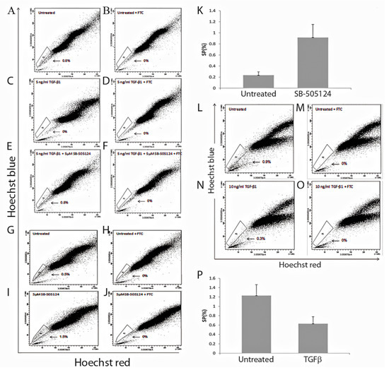 Bulk MCF7 cells were treated with 10 ng/mL TGF-β1, (use of 5 ng/mL did not effectively eliminate the SP population) for 3 days and SP analysis was performed. A significant reduction was observed between the untreated SP (Figure 4L) and the treated SP (Figure 4N) populations. Statistical analysis (based on the result of n = 7 biological replicates) revealed a significant reduction (p = 0.03), of the SP numbers when compared with untreated SP (Figure 4P). The SP phenotype was confirmed for all groups by the addition of FTC (Figure 4M,O). Treatment with SB-505124 was not possible in the MCF7 cells, as it caused cell death.