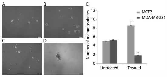 Following the different response of SP cells in the MCF7 and MDA-MB-231 cell lines to CoCl2 treatment, the mammosphere forming potential of both cell lines treated with CoCl2 was also determined. Both cell lines were capable of mammosphere formation. MCF7 (Figure 6A) and MDA-MB-232 (Figure 6C). However, following CoCl2 treatment the number of mammospheres was significantly increased in MCF7 (p = 0.002) (Figure 6B,E) but significantly decreased in the MDA-MB-231 cells (p = 0.008) (Figure 6D,E).