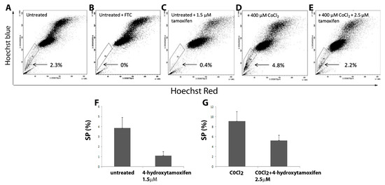 To determine the impact of Tamoxifen (Tam) on MCF7 SP we compared untreated MCF7 cells (Figure 7A) with cells treated with 1.5 μΜ Tam alone (Figure 7C) and with CoCl2 treatment alone (Figure 7D). Representative FACS images show untreated cells had a SP of 2.3% that was significantly decreased in cells treated with 1.5 μΜ Tam alone (p = 0.04) (Figure 7C,F) compared to control (Figure 7A). When treated only with 400 μM CoCl2 the percentage of SP cells increased above that of control (Figure 7D). Addition of 1.5 μΜ Tam to the CoCl2 treated cells did not successfully deplete the MCF7 SP. However, a higher concentration of Tam (2.5 μΜ) was capable of significantly reducing the SP numbers in cells exposed to CoCl2 (p = 0.03) (Figure 7E,G). The SP phenotype was again confirmed using the addition of FTC to untreated MCF7 (Figure 7B).