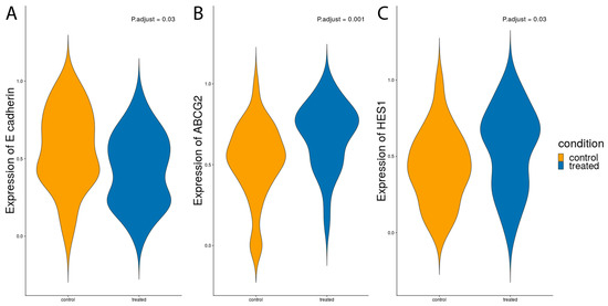 Using a single cell approach, we determined if exposure to CoCl2 influenced the expression of genes known to be stem cells markers, markers for proliferation, migration, invasion, drug resistance, EMT and MET in the MCF7 SP cells. Only three of these genes were significantly different in terms of expression. Violin plots show the distribution of transcripts for e-cadherin, ABCG2 and HES1 in CoCl2 treated and untreated MCF7 SP cells (Figure 8). Note that e-cadherin was significantly reduced following exposure to CoCl2 compared to untreated MCF7 SP cells (Figure 8A), whereas following CoCl2 treatment MCF7 SP showed an increase in ABCG2 expression (Figure 8B) and an increase in HES1 (Figure 8C) expression compared to untreated MCF7 SP, both of which were significant. None of the other genes examined showed significant changes between the treated and untreated cells.