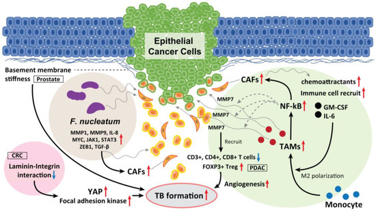 The role of TAM, laminin–integrin interaction, basement membrane stiffness, and F. nucleatum as a TB driver. TAMs located in the surrounding of the tumor mass induce loss of tight junction proteins at tumor cell–cell contacts, and cause TB from the colonosphere bulk of CRC. This is due to the MMP7 secretion by activating the NF-κB pathway. Moreover, CAF-derived exosomes serve as chemoattractants, which recruit various immune cells, including monocytes, promoting CRC progression and the release of cancer cell-derived exosomes. In PDAC, high-grade TB cases display lower M1 macrophages in the stroma and increased M2 macrophages in the tumor tissue, and displayed fewer CD3+, CD4+, and CD8+ T cells. Inversely, FOXP3+ Tregs were found to be elevated in high-grade TB cases. CAFs also recruit granulocyte-macrophage colony-stimulating factor and IL-6, promote the differentiation of monocytes into M2 macrophages and activate them to release chemokines and exosomes, which promote TB formation. Softening and enhanced remodeling of the basement membrane also promote TB development in stratified epidermis via the activation of focal adhesion kinase and YAP, while stiffening of the basement membrane promotes folding, and the laminin–integrin crosstalk in the basement membrane plays a key role to generate TBs. Moreover, F. nucleatum upregulated the expression of p-EMT-related genes in HNSCC cells with an epithelial phenotype. F. nucleatum-infected HNSCC cells had upregulated MMP1, MMP9, and IL-8. The expression of cell survival markers MYC, JAK1, and STAT3 and EMT markers ZEB1 and TGF-β were also significantly elevated and promoted TB development. These mediators also recruit CAFs in the TME and promote TB formation.