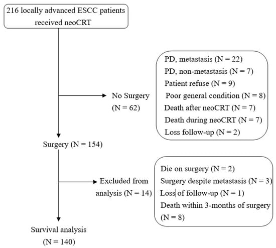 Flow chart of patient enrollment and exclusion. Abbreviations: ESCC: esophageal squamous cell carcinoma; neoCRT: neoadjuvant chemoradiotherapy; PD: progression of disease.