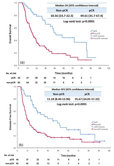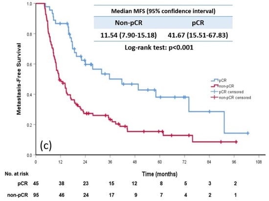 Kaplan–Meier curve for comparison between pCR and non-pCR patient subgroups. (a) OS; (b) DFS; and (c) MFS. Abbreviation: pCR: pathological complete response; OS: overall survival; DFS: disease-free survival; and MFS: metastasis-free survival.