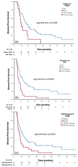 Kaplan–Meier curve of disease-free survival for comparison between patients (a) with vs. without preexisting T2DM; (b) with vs. without PNI; and (c) N0/N1 vs. N2/N3. Abbreviations: T2DM: type 2 diabetes; PNI: perineural invasion.