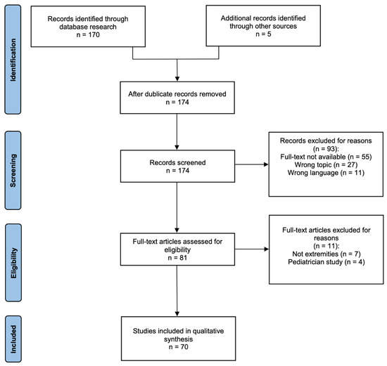 A comprehensive literature search was conducted, and studies published between 1 January 1977 and 15 November 2021 were included in this systematic review. PubMed was used as the primary database for the literature search. Additional potentially matching studies were identified by cross-searching article references through a backward and forward citation search. The review was performed in accordance with the Preferred Reporting Items for Systematic Reviews and Meta-Analyses (PRISMA) guidelines [28] Therefore, PubMed’s literature was searched using the following search string: soft-tissue sarcoma AND brachytherapy AND extremity. Four authors independently screened the published studies by title and thereafter by the given abstract. Of these publications, all reviews, prospective and retrospective studies, and case reports were included. Furthermore, studies in English and German were included. Finally, only articles for which the full text was available were considered. Characteristics of all cases are shown in Table 1. The flowchart for the literature analysis is given in Figure 1.