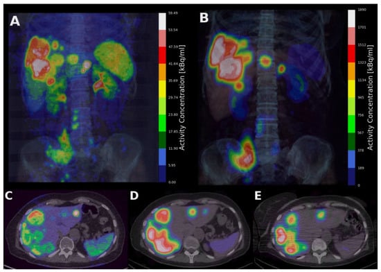 Pre-therapeutic PET/CT imaging (example in Figure 1A,C) was performed on a GE Discovery MI, 78 min (range: 54–96 min) post administration a nominal, fixed, activity dosage of 150 MBq [68Ga]Ga-DOTA-TOC for patients above 35 years old. The acquisition time was 100 s per bed with 50% overlap. The images were gated using the Varian trigger system and reconstructed in the expiratory phase (Q.Static). The images were reconstructed with a Bayesian penalised likelihood reconstruction (Q.Clear) with a beta factor of 500, on a 384 × 384 matrix of 1.82 mm pixels with a slice thickness of 2.79 mm. The CT scans were acquired at 120 kV and a dose modulation noise index of 34.5 and reconstructed with an iterative reconstruction (ASIR-V) with 40% filtering on 512 × 512 matrices. The pixel size was 0.84 mm with slice thickness 0.625 mm.