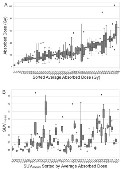 Box-and-whisker plots of [177Lu]Lu-DOTA-TATE absorbed dose (A); and [68Ga]Ga-DOTA-TOC SUVmean (B), representing all the analysed tumours in each patient. The patients are sorted by average tumour-absorbed dose in both figures.