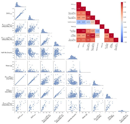 All parameters shown as scatter plots and their distribution on the diagonal. The inset heatmap shows the Pearson correlation coefficient where a significant linear correlation between parameters was found. The full data set is shown, and the predicted absorbed doses are based on the full data set.