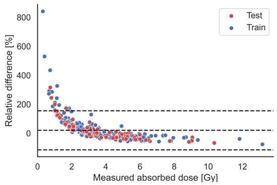 Relative error between predicted and calculated absorbed dose. The central dashed line is the average bias and the lower and upper 95% confidence intervals for the test are marked. Colours indicate whether the data point is from the training- or test-set. The predicted absorbed doses are calculated from parameters found in the training data set.