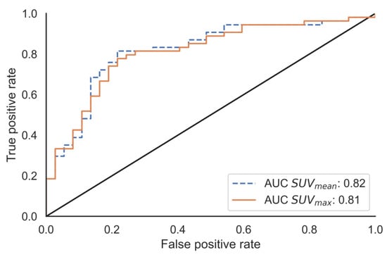 Using the population median absorbed dose, 23.3 Gy, as the cut-off point of a binary classifier, the predictive ability of the model was further tested. The performances of SUVmean and SUVmax were comparable according to the ROC analysis (Figure 5).