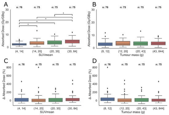 Differences of absorbed dose (A,B); and relative difference between predicted and calculated absorbed dose (C,D) between tumours grouped by SUVmean and tumour mass. Grouping was done by keeping group sizes equal. Stars indicate significant differences of the group means (Tukey test). Only the absorbed dose of tumours grouped by SUVmean was different between groups. A grouping based on equal ranges of mass and SUVmean-values is found in the Supplementary Materials (Supplementary Figure S3).