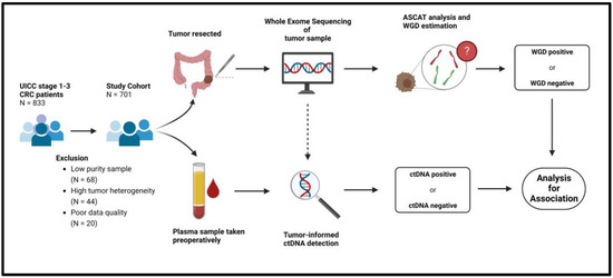 In this study, we aim to explore the impact of tumor WGD on the probability of detecting ctDNA in CRC patients. Furthermore, we investigate whether this association is affected by the UICC stage and tumor histopathology.