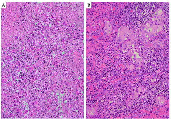 Tumor buds are strictly related to invasiveness, motility and epithelial/mesenchymal transition and are generally defined as isolated cells or clusters of 4 or 5 cells in intratumoral or peritumoral areas (Figure 1A) [20,21,22,23,24,25]. Cell nest size is another parameter that provides a qualitative measurement of cellular dissociation; its prognostic significance has already been demonstrated for oral, pulmonary and oesophageal tumors [20,21,22,23,24,25]. In the article by Jesinghaus et al., two cohorts of cervical squamous cell carcinomas patients were graded using this novel grading system [20]. Tumor-budding activity was considered as low (1–14 budding foci in 10 high power fields) and high (15 or more budding foci in 10 high power fields). Cell nest size was evaluated as follows: large (cell nests comprising more than 15 cells); intermediate (cell nests comprising 5–15 tumor cells); small (cell nests of 2–4 tumor cells) (Figure 1B); single-cell invasion (singular, discohesive tumor cells without nested architecture). In particular, the smallest identifiable cell nests were used in scoring. Finally, a score was attributed to both budding activity (1–3 points) and cell nest size (1–4 points); the sum of both scores results in a 3-tier grading system: G1 (score ranging from 2 to 3); G2 (score ranging from 4 to 5); G3 (score ranging from 6 to 7). By utilizing this novel grading, a significant prognostic impact has been demonstrated on overall survival (OS) and disease-free survival (DFS). Moreover, G2/G3 tumors were significantly associated with higher tumor stage, LVSI, perineural invasion and nodal metastases. Interestingly, data from Jesinghaus et al. have been further validated in a recent paper by Zare et al., which evidenced a significant association of the new grading system with OS, DFS, higher tumor stage and lymph node metastases [26].
