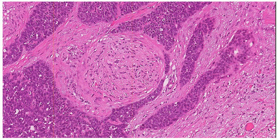 H&E stained section (10×) illustrating perineural invasion. In this example of squamous cell carcinoma of the uterine cervix with basaloid morphology, a small round nerve structure (center of the field) is surrounded by the neoplastic proliferation (×10).