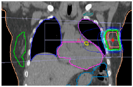 The following structures were contoured as organs at risk: ipsilateral and contralateral breasts and both lungs, the heart, the LAD (left anterior descending artery), ipsilateral rib cage, and spinal cord.