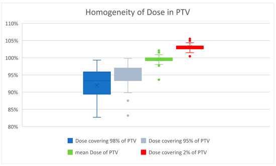 Dose maxima greater than 105% were carefully avoided because of the higher risk of developing fibrosis. The mean dose averaged 100%. The small boxes and short whiskers illustrate the consistent quality of treatment planning in patients.