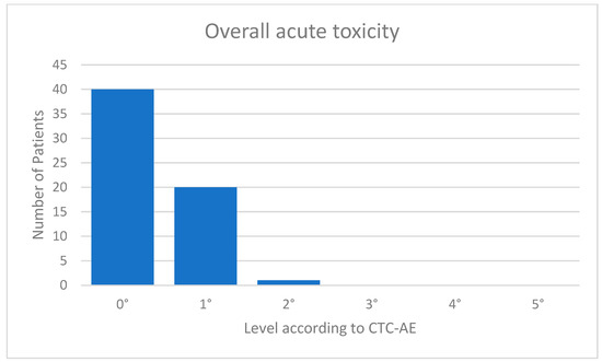 The acute toxicity values were very low. Eight (13%) of the patients suffered from fatigue CTC 1°; 13 (20%) showed mild erythema of the irradiated skin corresponding to CTC 1°; and one patient with a superficially located target volume had dry desquamation corresponding to CTC 2°. One patient complained of tenderness in the irradiated breast. Forty of 61 patients (=66%) were without any acute toxicities. An overview of the overall toxicity is given in Figure 3. In the follow-up examination after 3 months, all acute toxicities had resolved in all patients. There was no prolonged acute toxicity. The mean follow-up was 4.8 months.