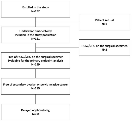 With a median follow-up of 7.3 years from the date of the RF (interquartile range: 6.0–8.3 years, max: 9.9 years), no ovarian or pelvic HGSC was reported among the 119 evaluable patients. The only pelvic oncologic lesion was a grade 3 cervical intraepithelial neoplasia (CIN3), incidentally discovered 5.6 years after the RF, and it was treated with a total hysterectomy without oophorectomy. Thus, the cumulative incidence of ovarian/pelvic invasive carcinoma is 0%.