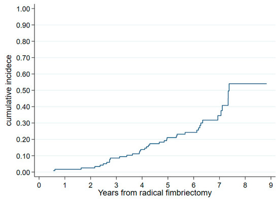 Cumulative incidence of oophorectomy from radical fimbriectomy (N = 119).