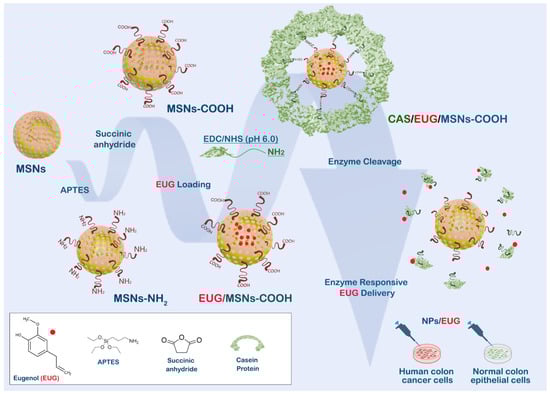 Design and functioning of the nanoassembly for targeting colon cancer cells. MSN is modified by carboxy groups, loaded with EUG, and covalently sealed by casein. Digestion of casein by MMPs released by cancer cells maximizes the toxicity of EUG against cancer cells while protecting healthy cells.