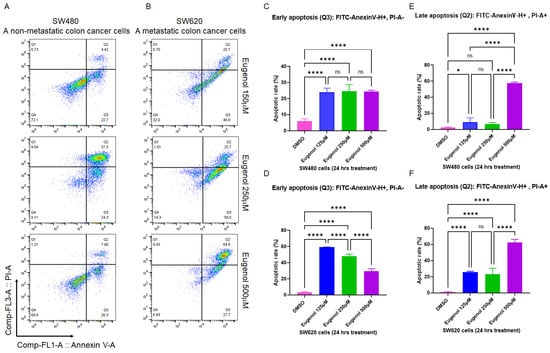 EUG induces apoptosis in metastatic colon cancer cells. Panels (A–F): The two isogenic human colon cancer SW480 and SW620 cell lines belong to separated tumor masses removed from the same patient. SW480 cells are initiated from the primary tumor, whereas the SW620 cells form the metastatic lymph node lesion. SW480 (Primary CRC) cells and SW620 (metastatic CRC) cells were incubated with DMSO or EUG (125, 250, and 500 μM) for 24 h, followed by PI/annexin V flow cytometry analysis. Collected flow cytometry results were analyzed using FlowJo software to determine the % of Annexin V-positive (early apoptosis) versus Annexin V/PI-positive cell populations in the presence and the absence of EUG. Panels (A,C,E) show significant induction of late apoptosis in SW480 by 500 μM EUG. Similar significant late apoptosis signals were measured in metastatic SW620 cells in the presence of 500 μM EUG (Panel (F)). Meanwhile, measurement of early apoptosis (Annexin-positive, PI-negative) showed a sensitivity of both cell lines to EUG (Panels (C,D)). Four independent experiments were carried out in triplicate (p-value * < 0.05, **** < 0.0001, mean ± standard deviation). ns—non significant.