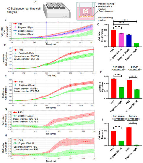 xCELLigence Real-Time Cell Analyzer (RTCA, Agilent, Santa Clara, CA, USA) system technology measured cell migration, invasion, and adhesion assays in real-time, as previously described [44]. GraphPad Prism (version 9) was used to analyze the rate of cell proliferation (slope) during a critical time window for the HCT-116 cell line in the presence and absence of 10% FBS in McCoy’s 5a Medium. Cells treated with Dimethylsulfoxide (DMSO) or EUG were immediately loaded (2 × 104 cells) into gold microelectrode plates. E-plates were used for the cell adherent assay, and CIM-plates ± Matrigel were used for migration and invasion assays. The xCELLigence system was used to measure the impedance value of each well every 15 min for 120 h. The outcome of measurements is a CI (cell index) value for cell adhesion, migration, and invasion. Plots were used to illustrate the CI value for overtime points. As previously described [45], the critical time point for cell adhesion, migration, and invasion was approximately 50 to 70 h after starting the experiments.