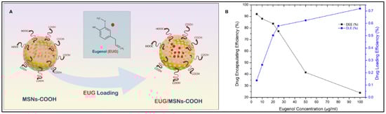 (A) Eugenol EUG loading into the MSN pore channels, (B) Effect of EUG concentration on drug loading efficiency (DLE) and drug encapsulation efficiency (DEE) of MSN nanoassemblies, 25 µg/mL EUG concentration was identified as the optimum concentration that was efficiently loaded to the MSN channels.