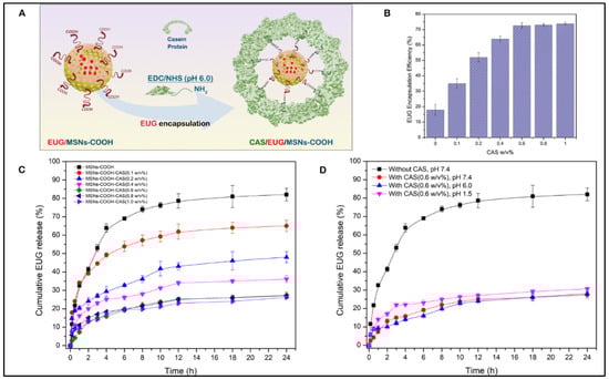 (A) Conjugation of casein to the carboxy-functionalized MSN particles after NHS/EDC activation, (B) The encapsulation efficiency of eugenol (EUG) for 24 h along with varying w/v% of casein as a capping layer for EUG-loaded MSN nanoassemblies, (C) Cumulative release (%) profiles of EUG from EUG/CAS-MSNs–COOH at different w/v% of casein at pH 7.4, RT, to obtain the effect of casein capping layer for EUG release over 24 h. The black curve represents EUG release profiles without any casein conjugation to the EUG/MSNs–COOH. (D) Cumulative release (%) profiles of EUG from EUG/CAS-MSNs–COOH (0.6 w/v% casein) at different pH conditions, pH 7.4 (Red curve), pH 6.0 (Blue curve), pH 1.5 (Pink curve). The black curve represents EUG release profiles without any casein conjugation to the EUG/MSNs–COOH at pH 7.4, RT. Each data point represents the mean of the experiments performed in triplicate and their corresponding standard deviation.