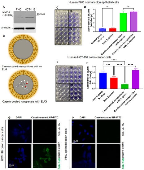 EUG delivered by casein-coated NP decreases cell viability in HCT-116 cells while FHC cells remain intact. (A) Anti-MMP-7 shows high expression of MMP-7 in colon HCT-116 colon cancer cell line, while FHC cells showed no trace of intracellular MMP-7. The whole western bolts is shown in Figure S3. HCT-116 and FHC cells were treated with pure EUG (125 μM), casein-coated NPs without EUG, and casein-coated NPs with 125 μM EUG (panel (B)) for 48 h, followed by crystal cell viability assay. Absorption of stained cells per well was measured by plate reader. Panels (C,E) show the attached FHC and HCT-116 cells stained with crystal violet. I. Pure Eugenol, II. Casein-coated nanoparticles with EUG. III. Casein-coated nanoparticles with no eugenol, and IV. control group (DMSO). Calculated results show that pure EUG significantly decreased cell viability in HCT-116 cells, and had no effect on FHC cells (red column versus blue column in panels (D,F)). More importantly, delivery of 125 μM EUG by NPs to HCT-116 cells further enhanced the reduction in cell viability (green column in panel (F)). The casein-coated NPs without EUG increased the adherence of cells in HCT-116 and FHC (N = 4, p *** < 0.001, **** < 0.0001, mean ± SD). Panels (G,H). HCT-116 and FHC were incubated with casein-coated MSNs–FITS (green signals) particles for 90 min and stained with DAPI (blue signals). The Z-stack images show that only HCT-116 colon cancer cells have an affinity to MSNs, and 90 min was enough for partial internalization of NPs to the cytoplasmic compartment (Scale bar is 10 μM). ns—non significant.