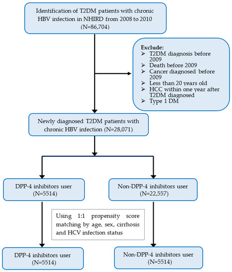 Flow chart of study patient selection. Abbreviations: T2DM, type 2 diabetes mellitus; HBV, hepatitis B virus infection; NHIRD, National Health Insurance Research Database; DPP-4 inhibitors, dipeptidyl peptidase-4 inhibitors.
