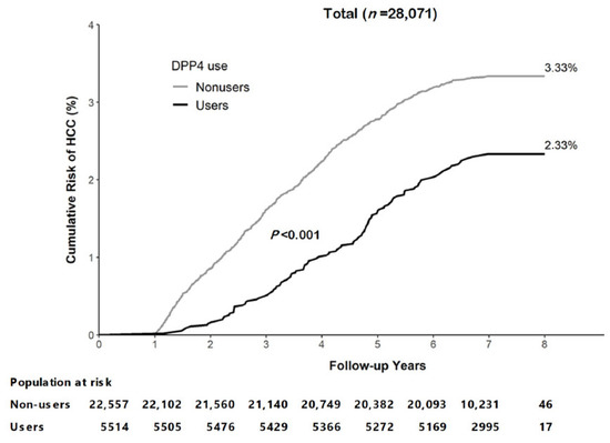 Furthermore, T2DM is closely associated with non-alcoholic fatty liver disease (NAFLD) and with the faster progression of NAFLD to NASH, cirrhosis, and HCC. Increasing evidence suggests that newer classes of antiglycemic agents, such as peroxisome proliferator-activated receptor agonists (PPAR), GLP-1 agonists, DPP-4 inhibitors, or SGLT-2 inhibitors, could reduce the rates of NAFLD progression [40,41,42]. Our study suggests that these additional extra-hepatic benefits of DPP-4 inhibitors are potentially important, not only in NAFLD, but also for T2DM patients with chronic hepatitis virus infection.