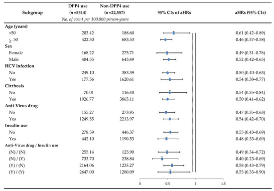 Subgroup analysis of DPP-4 inhibitors use for the reduced risk of hepatocellular carcinoma. Stratified by one of the following parameters and adjusted for the remaining of the following parameters: age, sex, chronic HCV infection, cirrhosis, anti-virus drug use, and insulin use. Abbreviations: HCV, hepatitis C virus; aHRs, adjusted hazard ratios; CIs, confidence intervals.