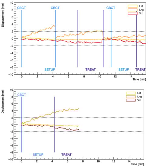 Intrafraction prostate motion metrics during beam delivery were calculated in lateral, longitudinal, and vertical directions and in 3D in both case A and case B. The prostate displacements were all calculated relative to the tracking starting point position, defined at the beginning of the acquisition of the first daily CBCT.
