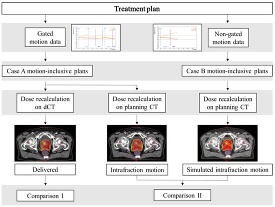 Moreover, case A and case B motion-inclusive plans were recomputed on the planning CT images for each fraction. A direct comparison between the individual fraction and patient cumulative DVHs of the two plans was used to quantify any variation only due to the implementation (or not) of an online target motion management strategy. Thus, an estimate of which dose distributions would have been delivered to the patients if beam gating and motion correction were not employed was available. Afterward, this dosimetric analysis is referenced as “comparison II”. Figure 2 summarizes the data reconstruction process and the dosimetric comparisons performed in the study.