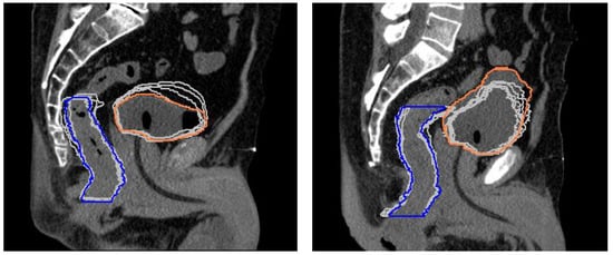 Superposition of rectum and bladder contours from the planning CT (colored lines) and each treatment fraction (gray lines) for the two patients who had the minimum (left) and maximum (right) bladder volume in the simulation.