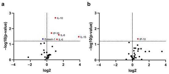 Identification of cachexia-related circulating cytokines. Circulating cytokines with significantly different levels between cachectic and non-cachectic patients at baseline (a) and after one cycle of PD-1/PD-L1 blockade treatment (b). In the volcano plot, the horizontal dashed line shows where p = 0.05, with dots above the line having p < 0.05 and dots below the line having p > 0.05. The vertical dotted line represents no difference in cytokine levels between cachectic and non-cachectic patients. The blue dot represents a low cytokine level in a cachectic patient, whereas the red dots represent high cytokine levels in patients with cachexia.