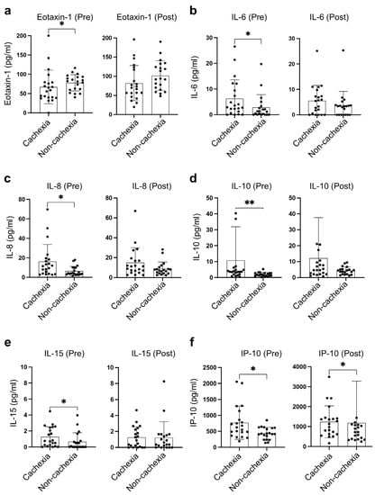 Among 41 circulating inflammatory cytokines, the levels of six cytokines were found to be significantly different between cachectic and non-cachectic patients (Figure 1a,b). Of these six cytokines, IL-6, IL-8, IL-10, and IL-15 at baseline, and IP-10 at both baseline and during treatment were significantly higher in patients with cachexia than those without. In contrast, the baseline eotaxin-1 in patients with cachexia was significantly lower than that in non-cachectic patients (Figure 2).