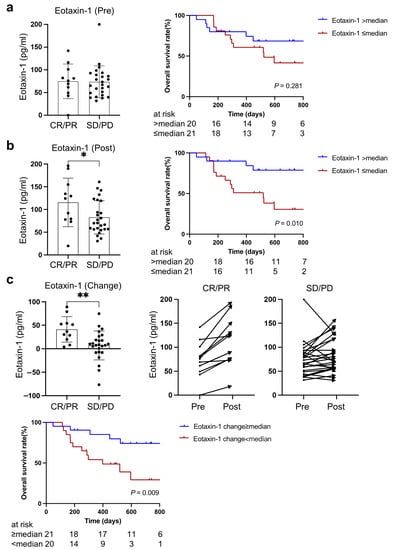 Notably, eotaxin-1 significantly increased after one cycle of PD-1/PD-L1 blockade treatment in all patients with CR or PR compared to patients with SD or PD (p = 0.003). A greater increase in eotaxin-1 after one cycle of PD-1/PD-L1 blockade treatment was associated with better overall survival (74.1% vs. 29.3%, p = 0.009) (Figure 3c).