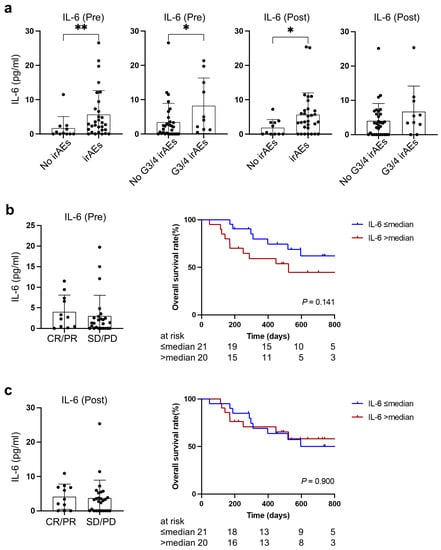 There was no significant association between therapeutic response and IL-6 at baseline or during treatment, although patients with higher IL-6 at baseline tended to have worse overall survival (two-year survival rate: 44.9% vs. 61.9%, p = 0.14) (Figure 4b,c).