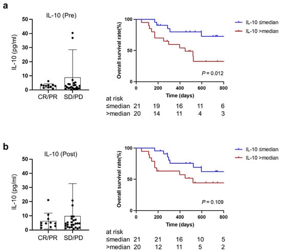There was no significant difference in IL-10 between patients who achieved objective response (CR or PR) and patients with SD or PD. However, higher IL-10 both at baseline and during treatment was associated with poorer overall survival (two-year survival rate: 32.5% vs. 72.6%, p = 0.012; 44.3% vs. 62.3%, p = 0.109) (Figure 5a,b). This was in line with our previous findings that patients with cachexia were likely to have higher IL-10 and poorer overall survival.