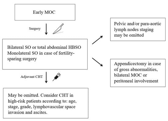 Flowchart of the clinical management of the early-stage MOC according to the most recent evidence (CHT: chemotherapy; HBSO: hysterectomy with bilateral salpingo—oophorectomy; MOC: mucinous ovarian cancer: SO: salpingo—oophorectomy).