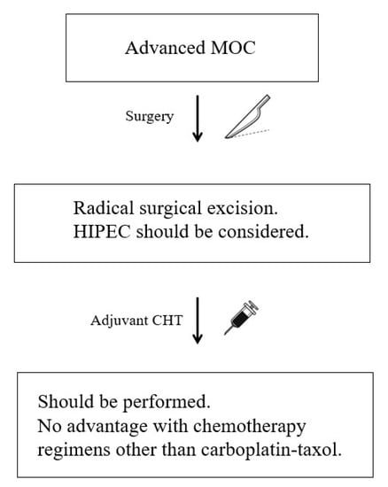 Flowchart of the clinical management of advanced MOC according to the most recent evidence (CHT: chemotherapy; HIPEC: hyperthermic intraperitoneal chemotherapy; MOC: mucinous ovarian cancer).