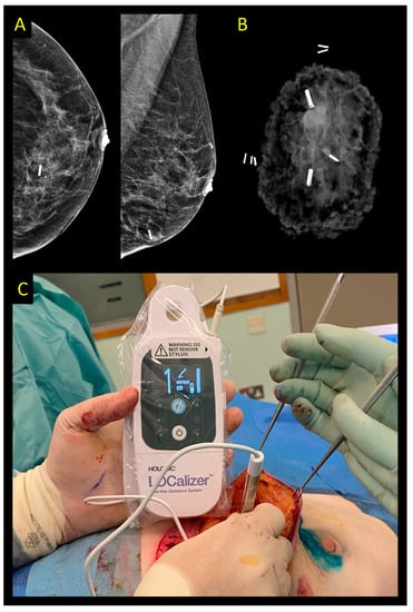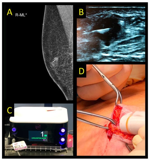 - Lamb, L.R.; Gilman, L.; Specht, M.; D’Alessandro, H.A.; Miles, R.C.; Lehman, C.D. Retrospective Review of Preoperative Radiofrequency Tag Localization of Breast Lesions in 848 Patients. AJR Am. J. Roentgenol. 2021, 217, 605–612. [Google Scholar] [CrossRef]
